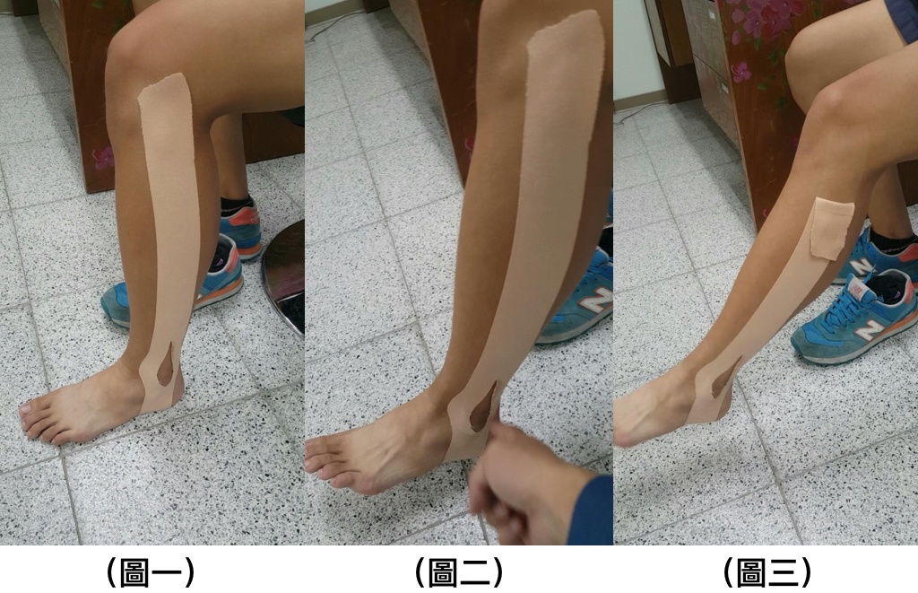 大家可以嘗試摸著自己的腓骨頭再動動腳踝,會發現腳踝活動時,腓骨頭是連帶在活動的。因此上述貼紮部分限制了腓骨的正常活動,連帶影響了腳踝運動,在長跑訓練中便可能造成跟腱外側的勞損。最後,當我們將最上段的肌貼撕掉放鬆(如圖三),選手的跟腱疼痛便立即有明顯的改善,證實了我們的想法。